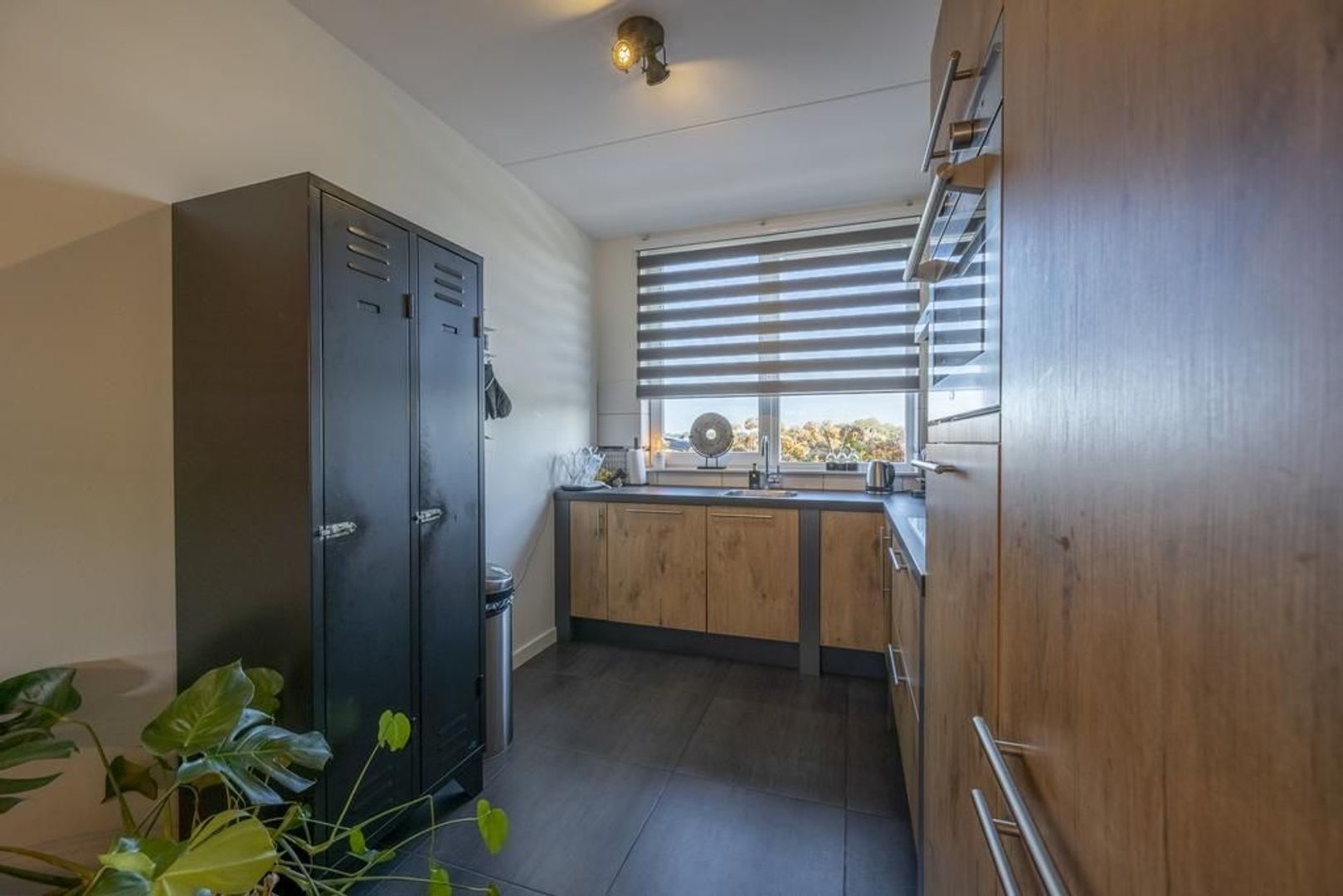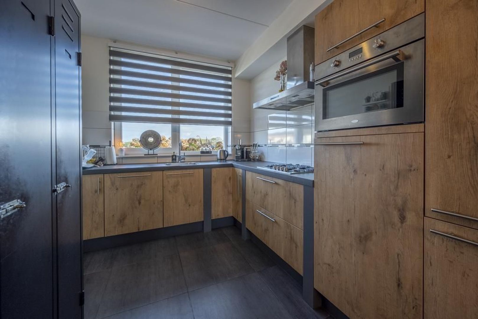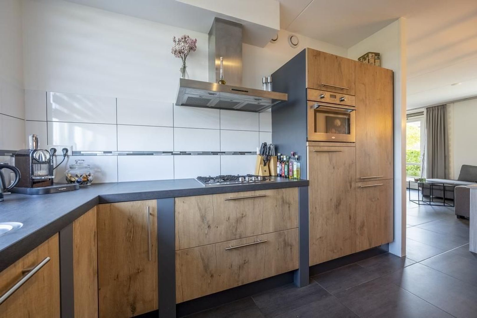De L-vormige keuken is stoer en heeft een industriële uitstraling. Deze is voorzien van een Boretti vierpits gaskooplaat, afzuigkap, vaatwasser, Boretti combi-magnetron en koel- vriescombinatie.