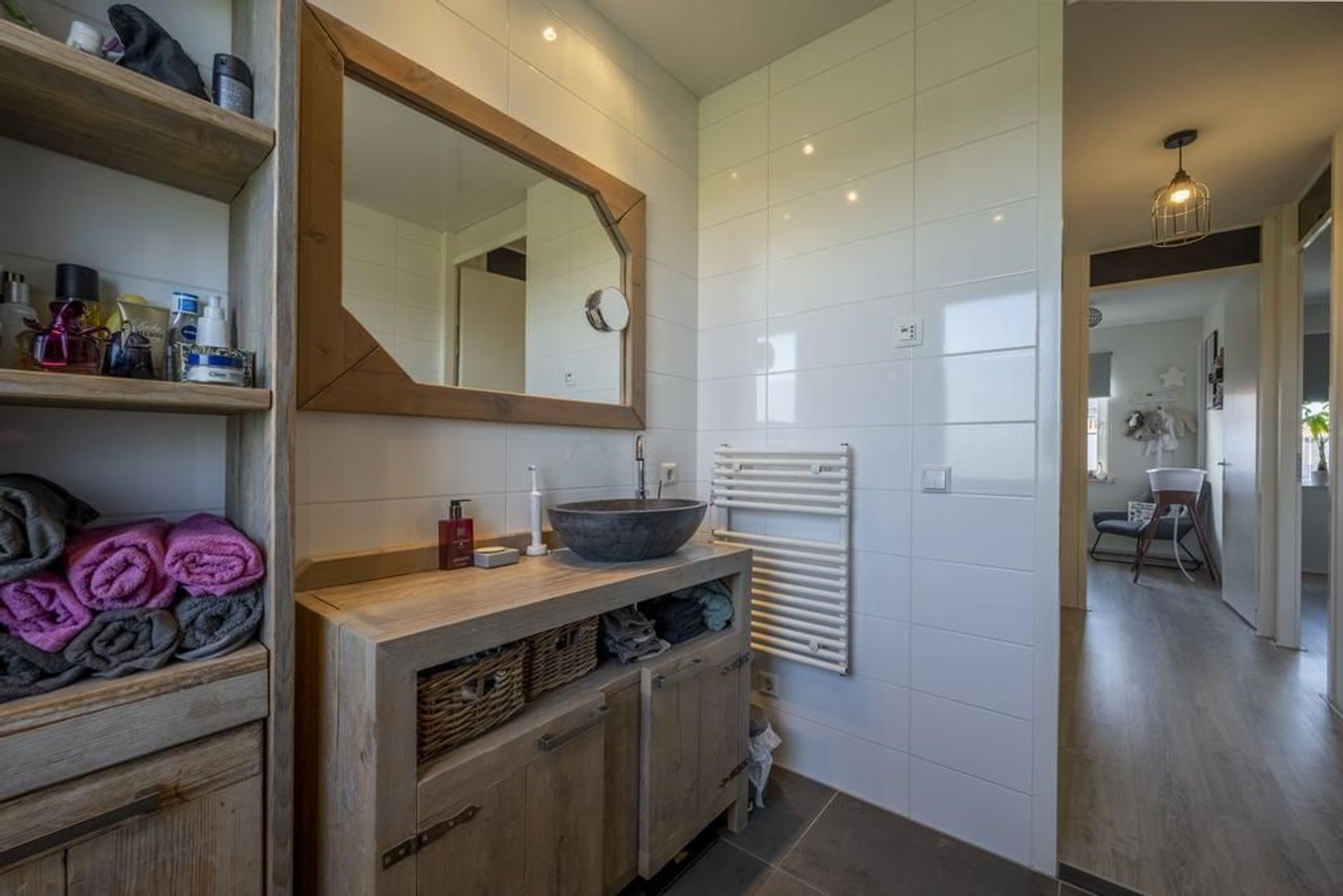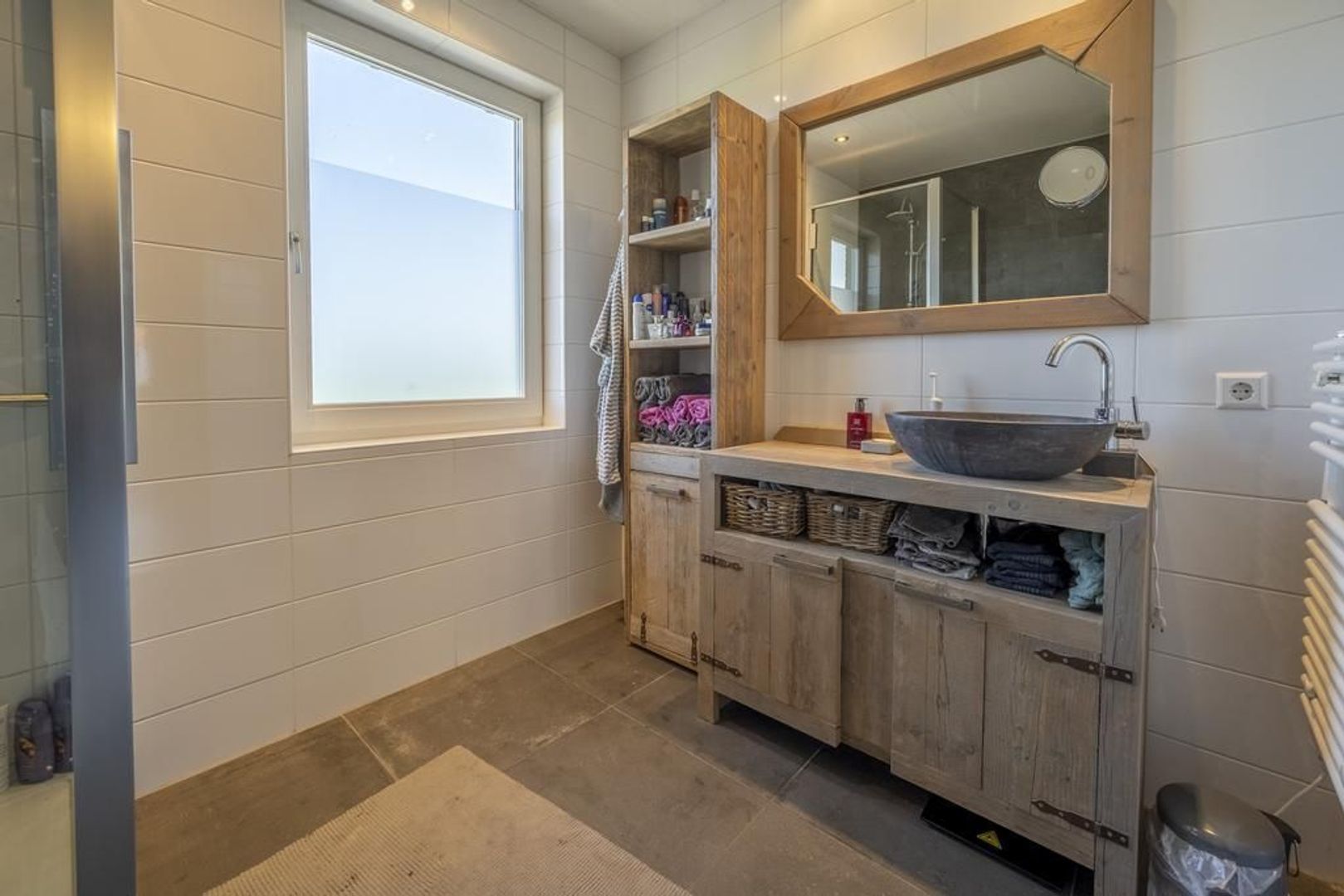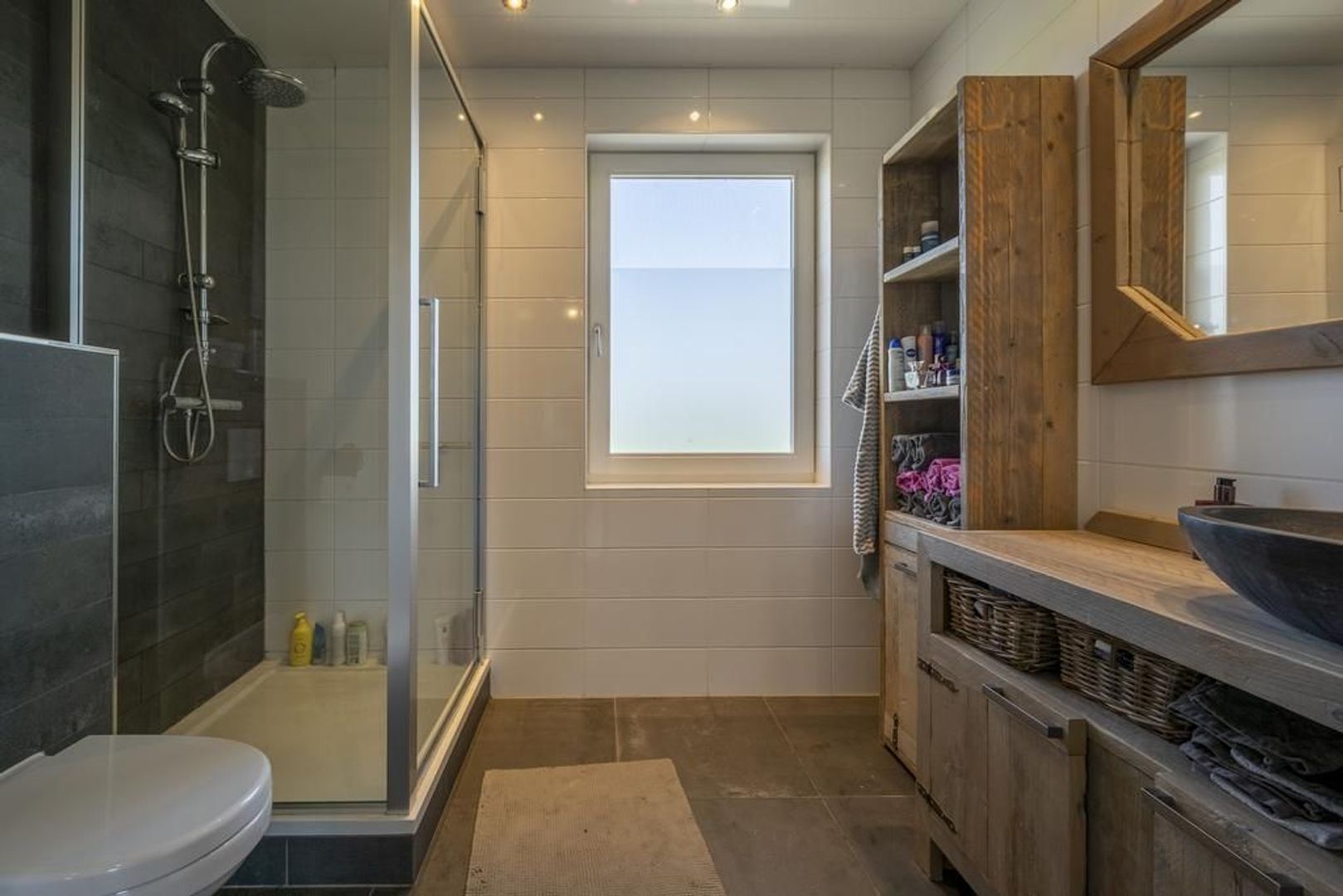 Op de eerste verdieping zijn drie prima slaapkamers. De luxe badkamer is ingericht met een inloopdouche met regendouche, een tweede toilet en een stoer wastafelmeubel met waskom.