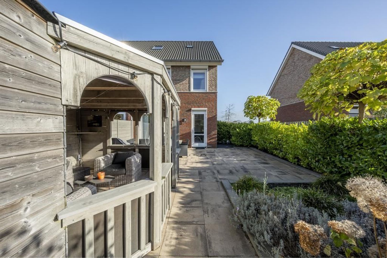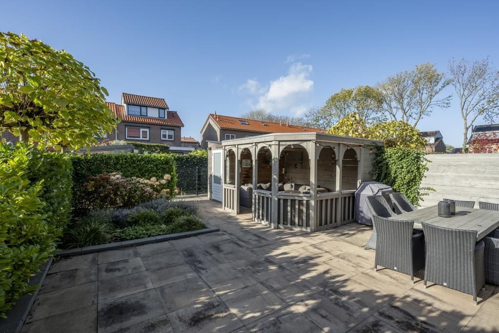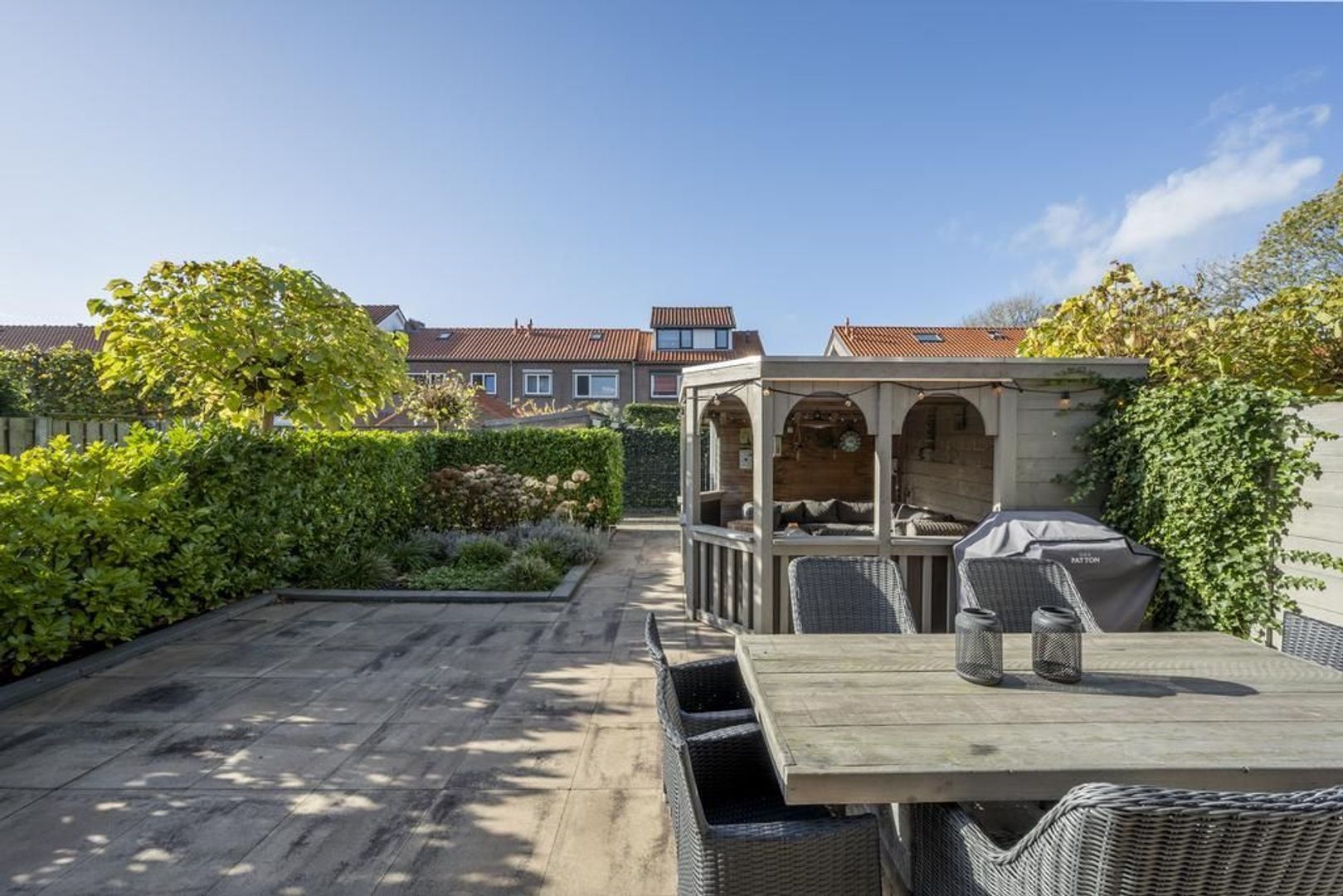De mooi aangelegde achtertuin heeft een gunstige ligging op het westen. Achterin staat de houten berging en er is een stoere overkapping geplaatst, waarin je jaarrond kunt genieten.