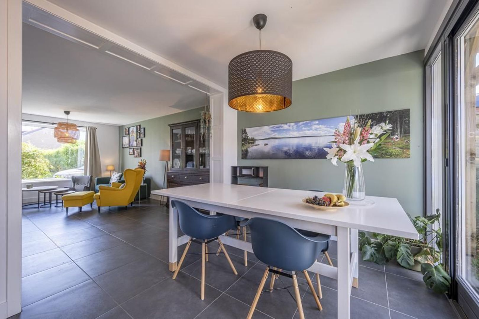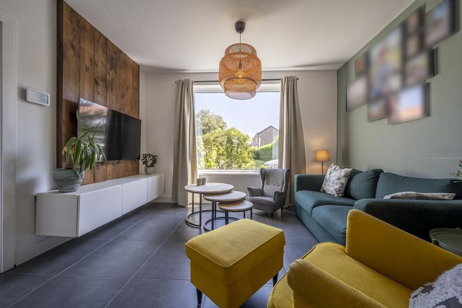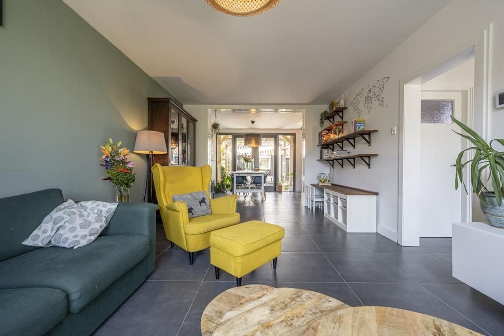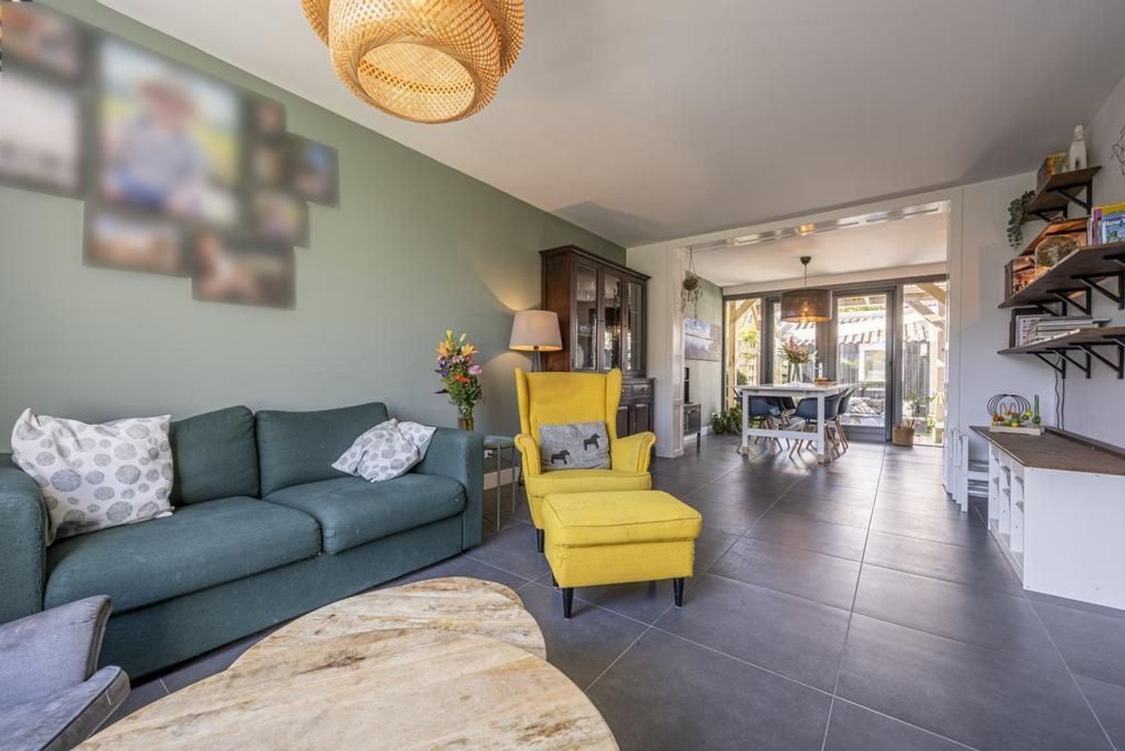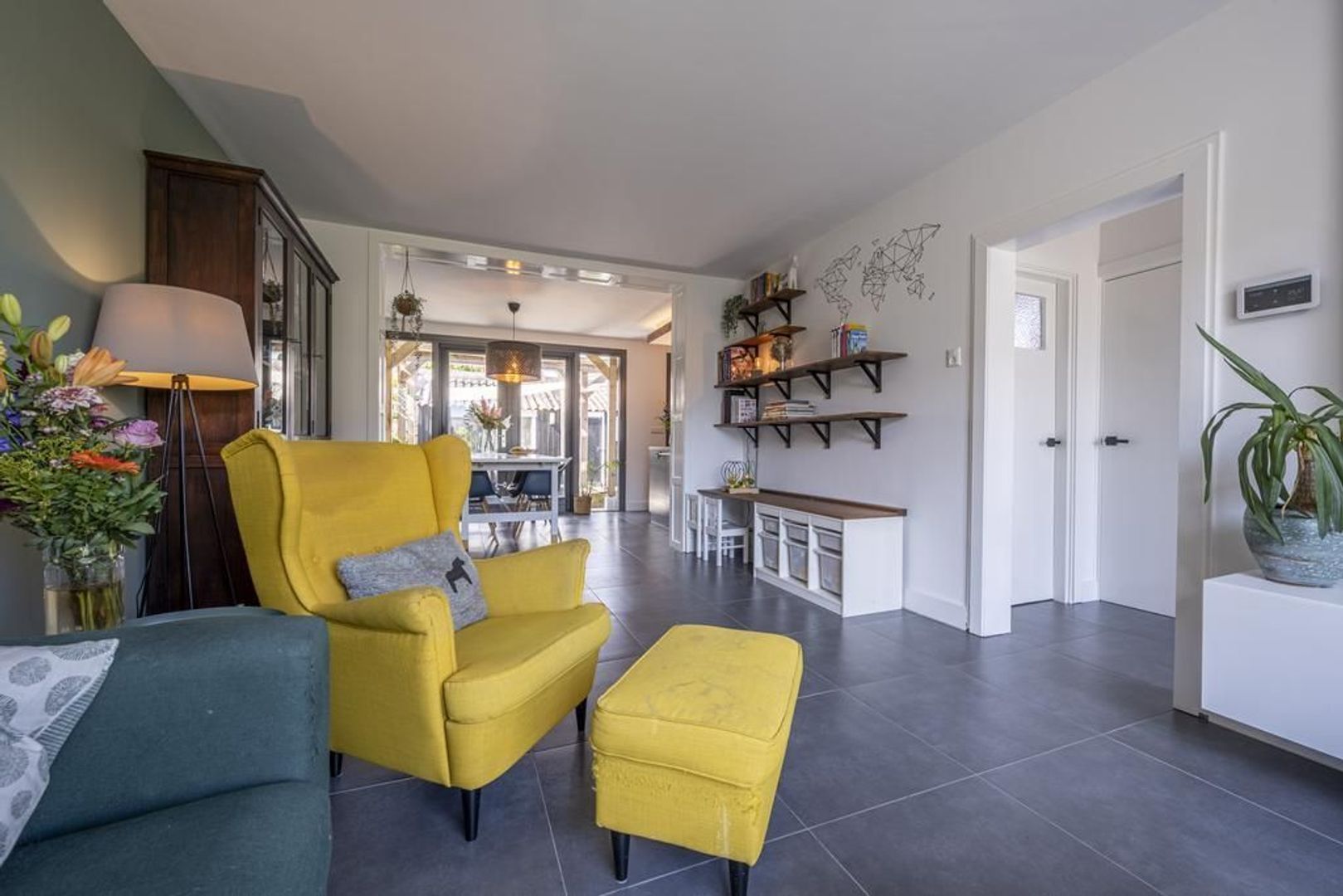 Gezellige woonkamer met nieuwe aanbouw aan de achterkant, voorzien van openslaande deuren.
