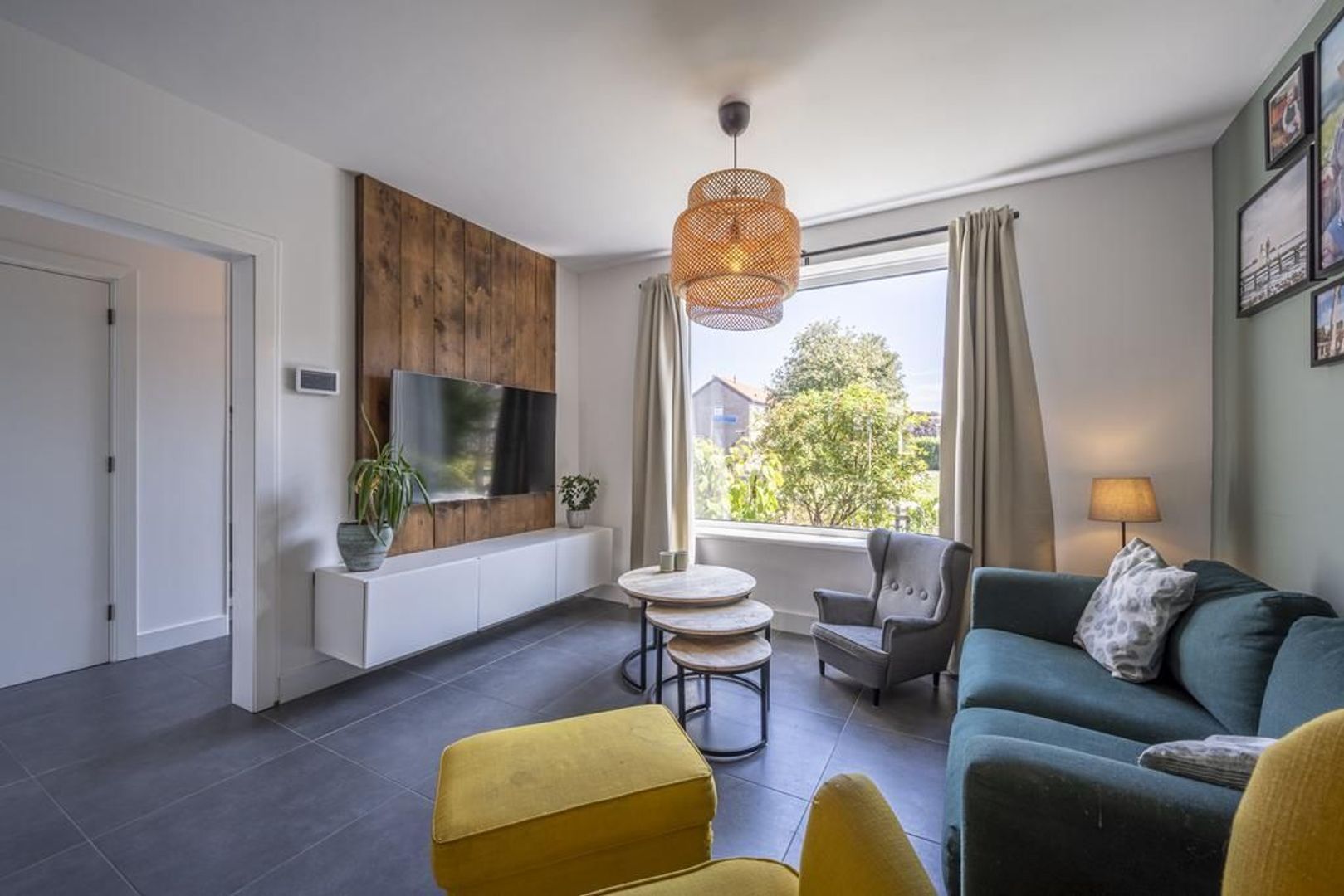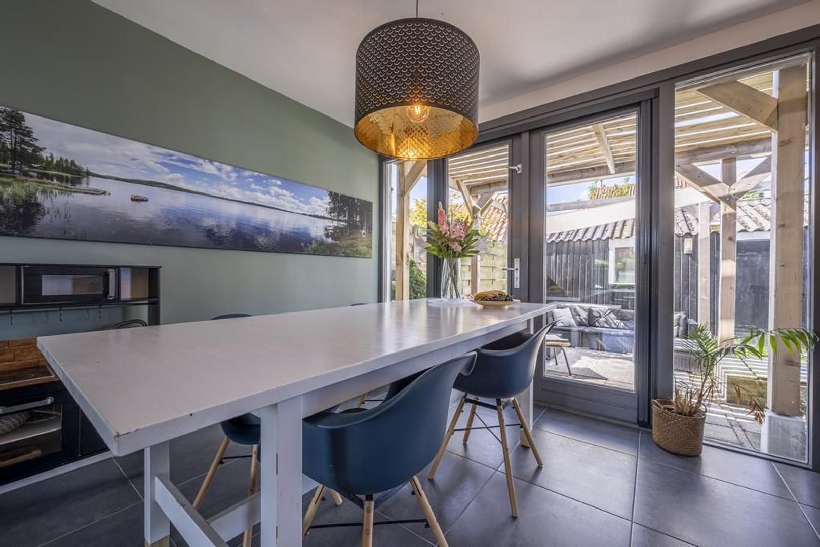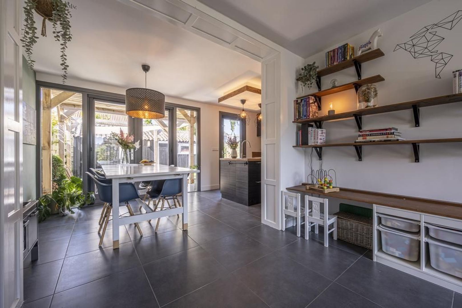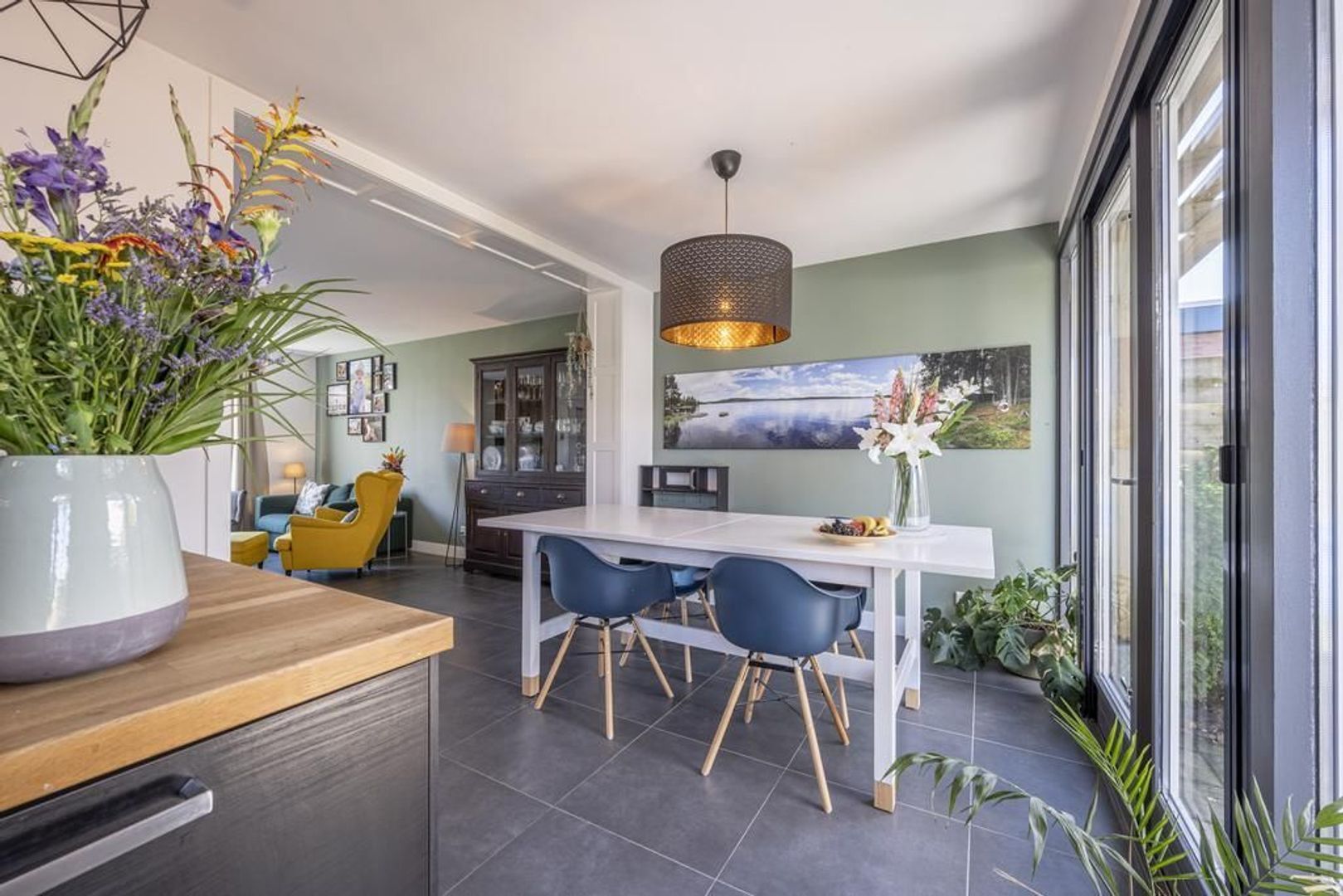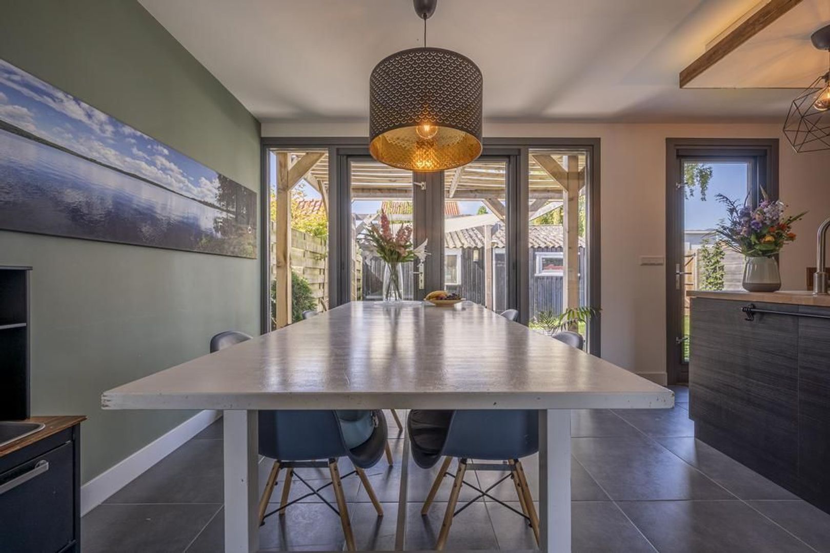 Gezellige woonkamer met nieuwe aanbouw aan de achterkant, voorzien van openslaande deuren.