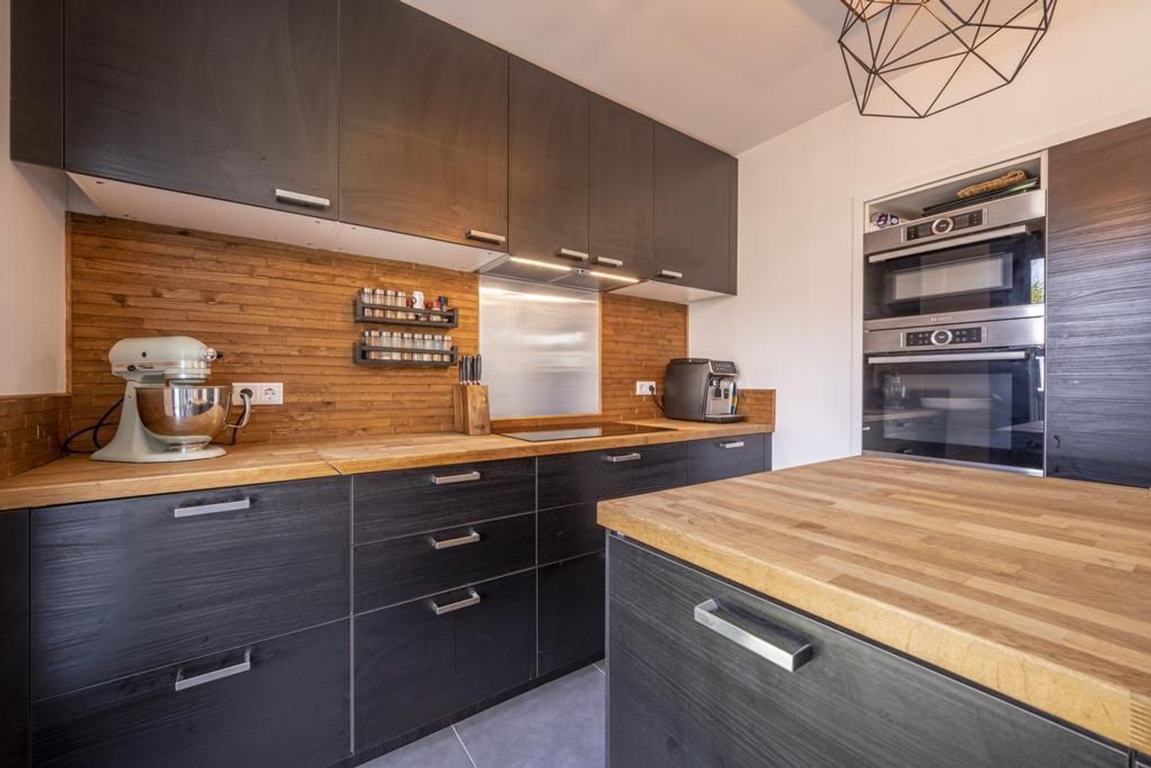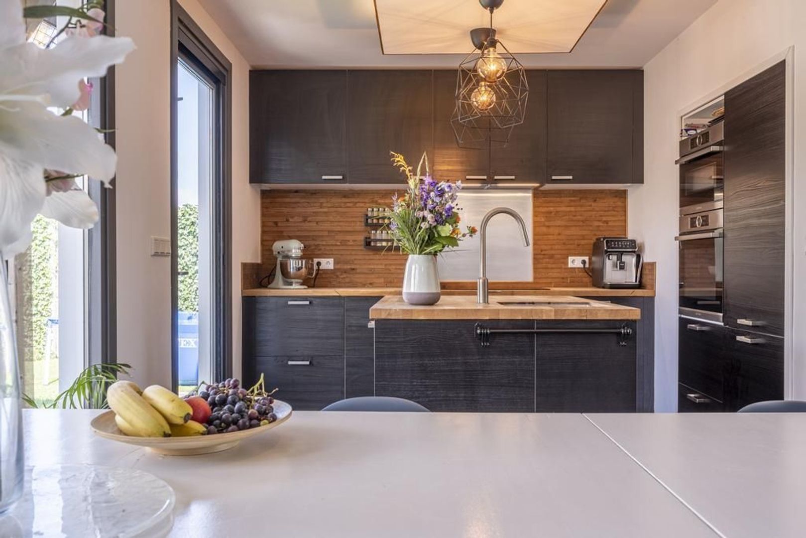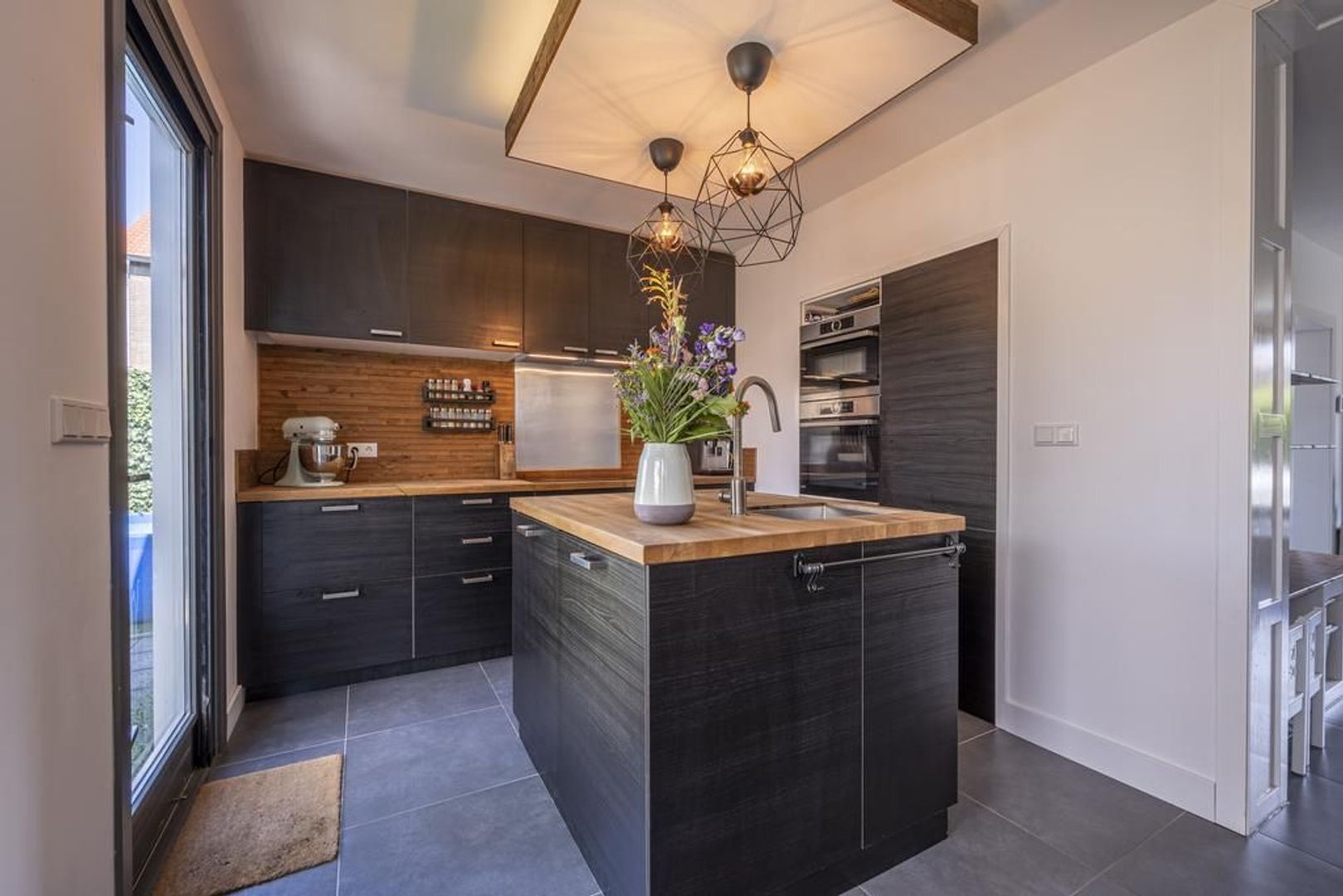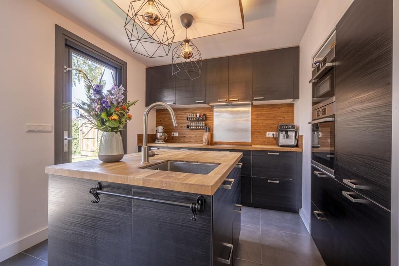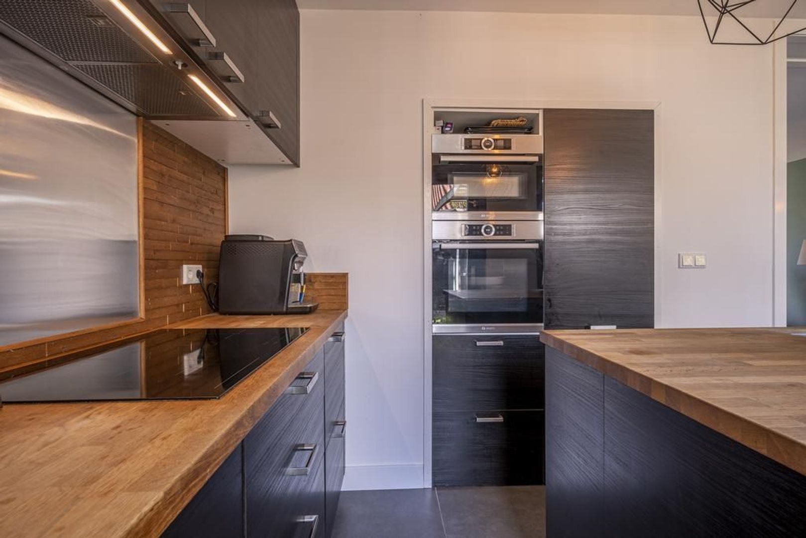 Mooie open keuken met wandopstelling en eiland, uitgevoerd met een inductiekookplaat, afzuigkap, oven, vaatwasser, combi-magnetron en koel-vriescombinatie.