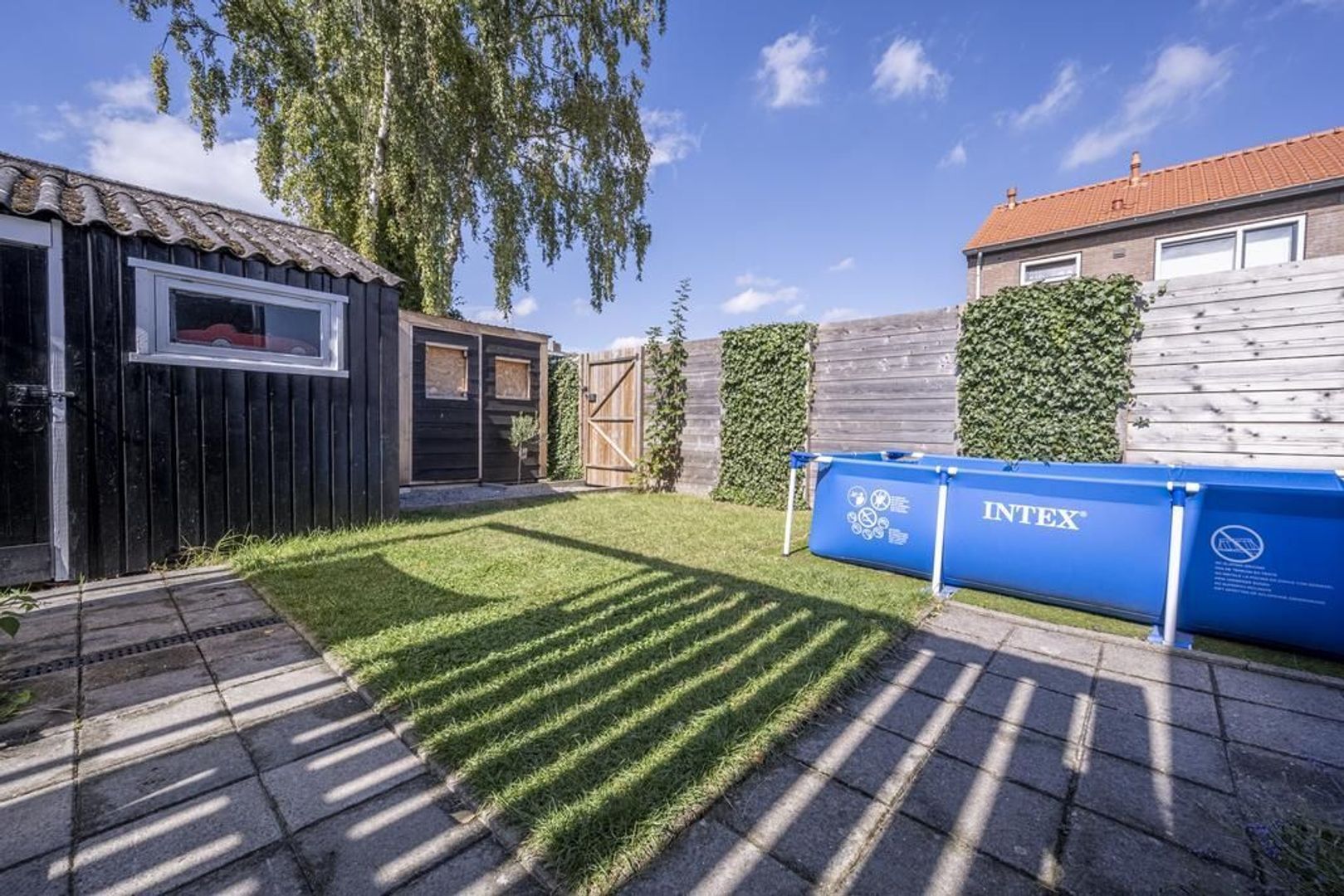 Achterin staat de garage, die nog in oude staat verkeert, en een houten berging.