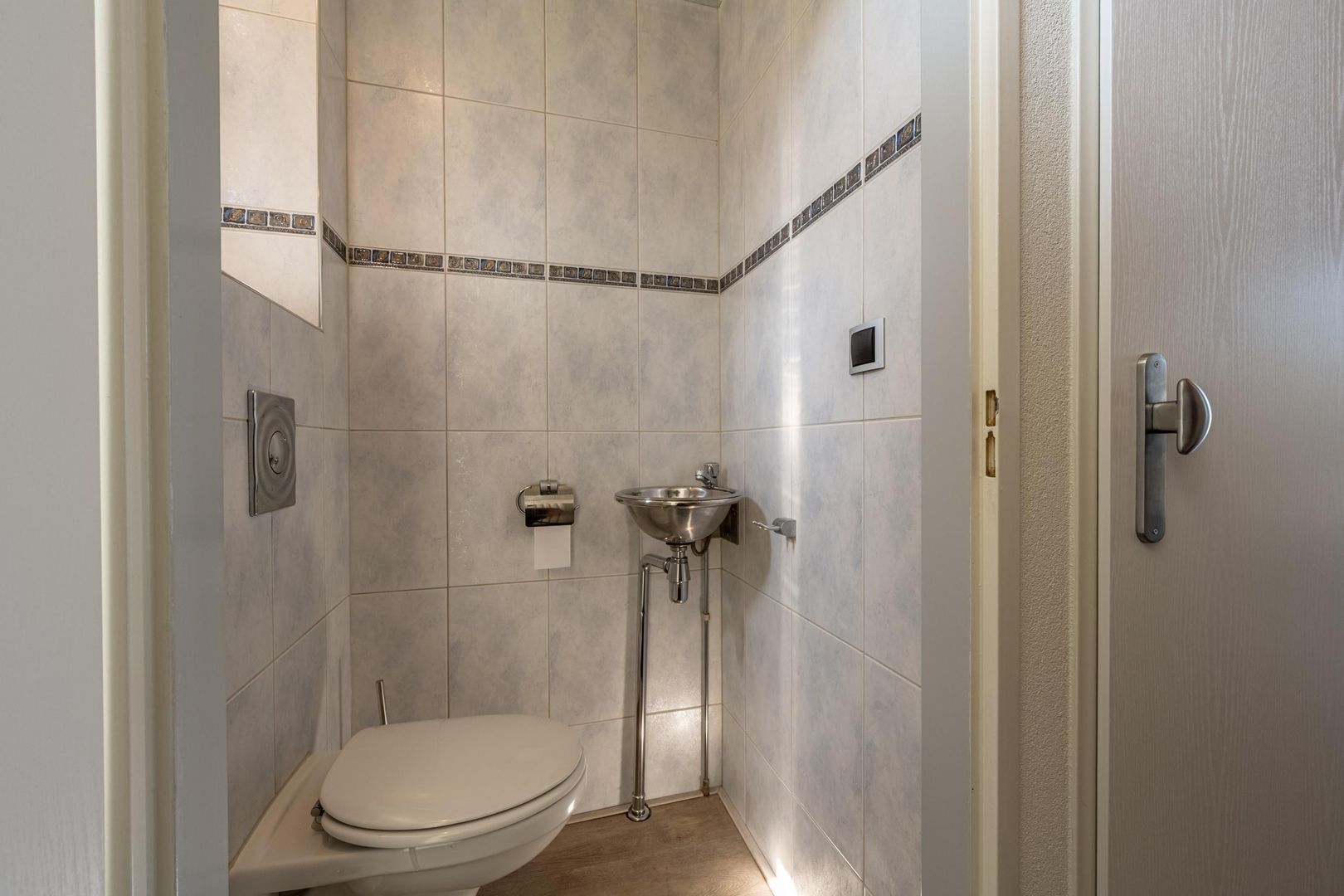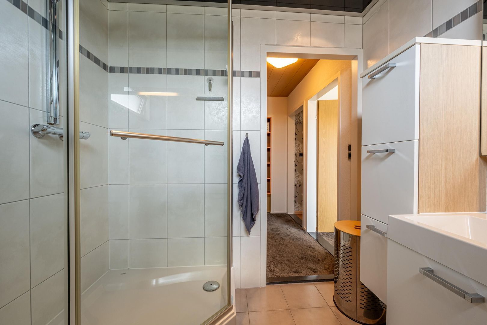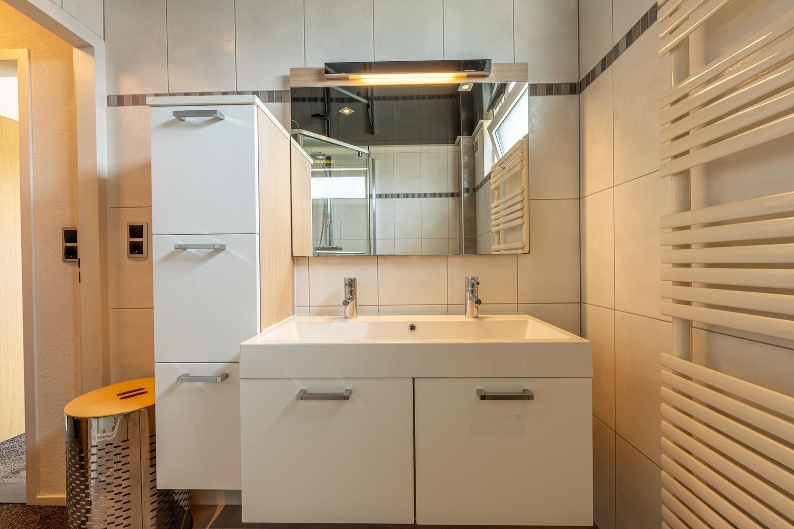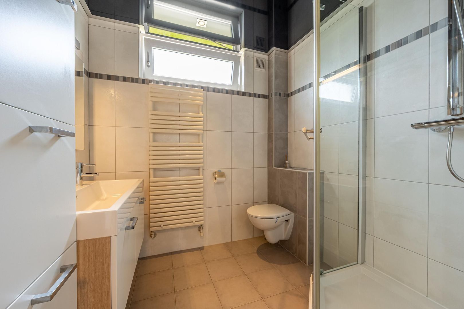 Deze is ingericht met een dubbel wastafelmeubel, een douchegelegenheid en een tweede toilet. Het raam maakt ventileren met frisse buitenlucht mogelijk.