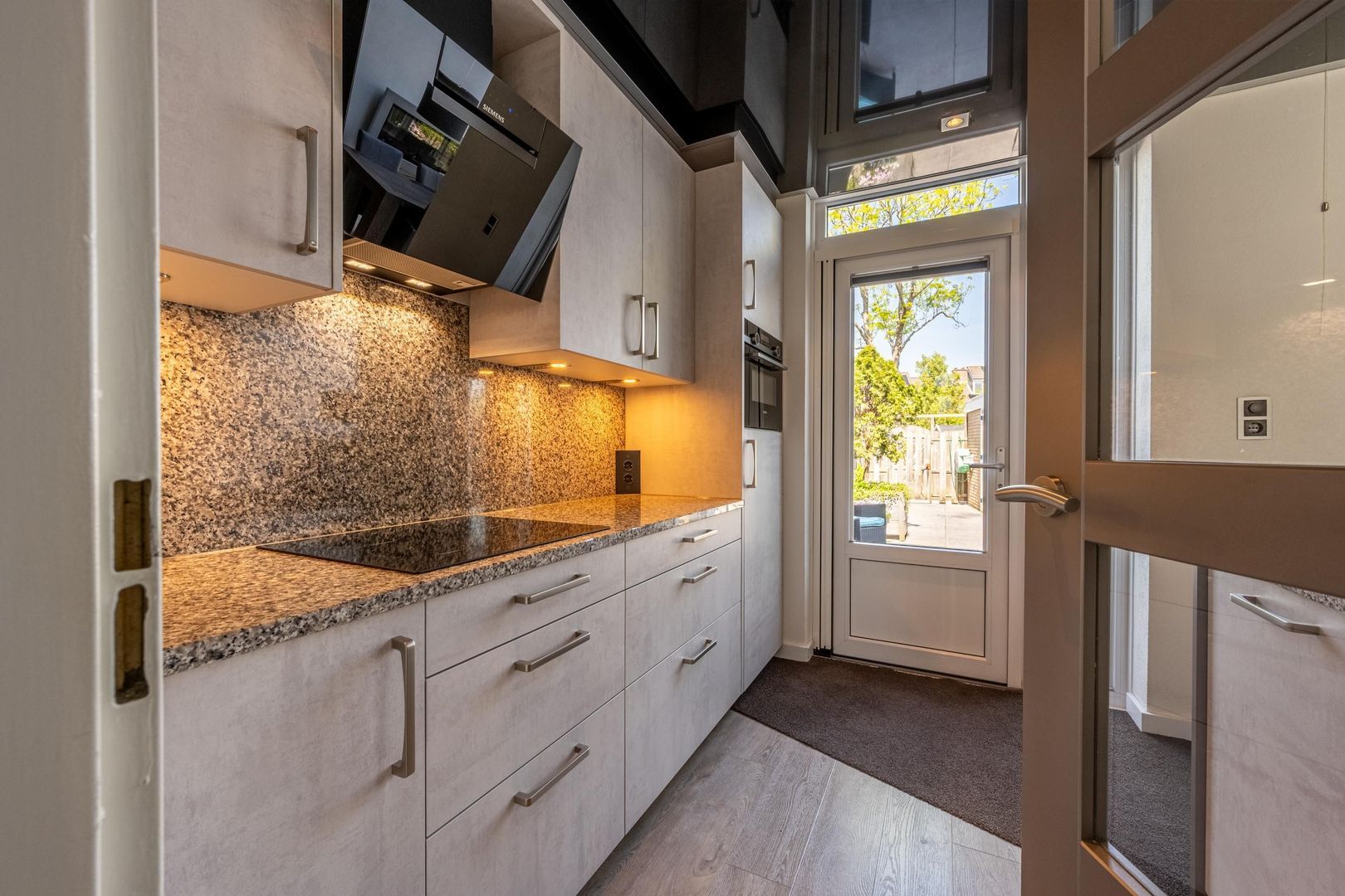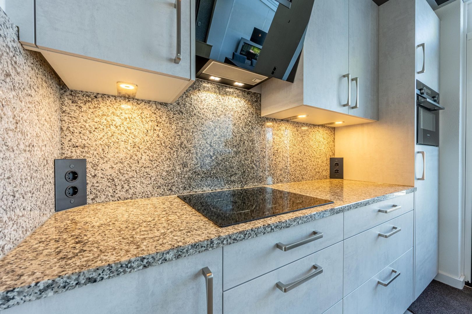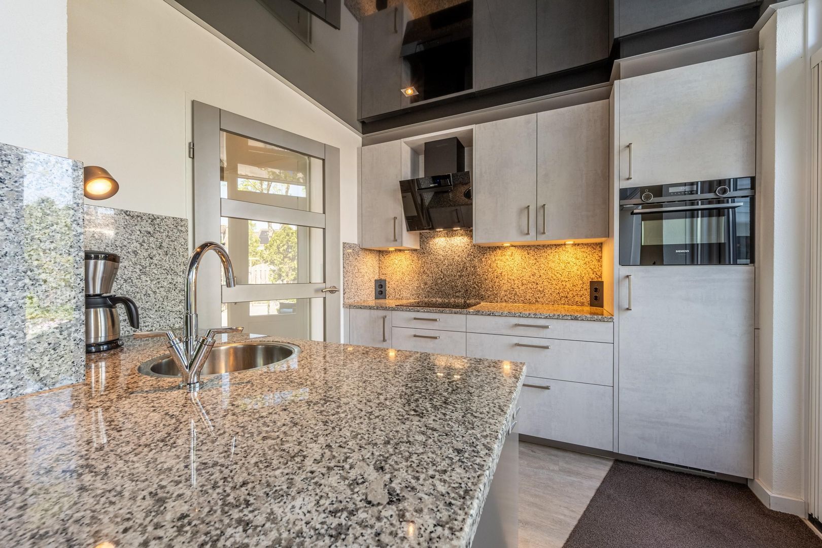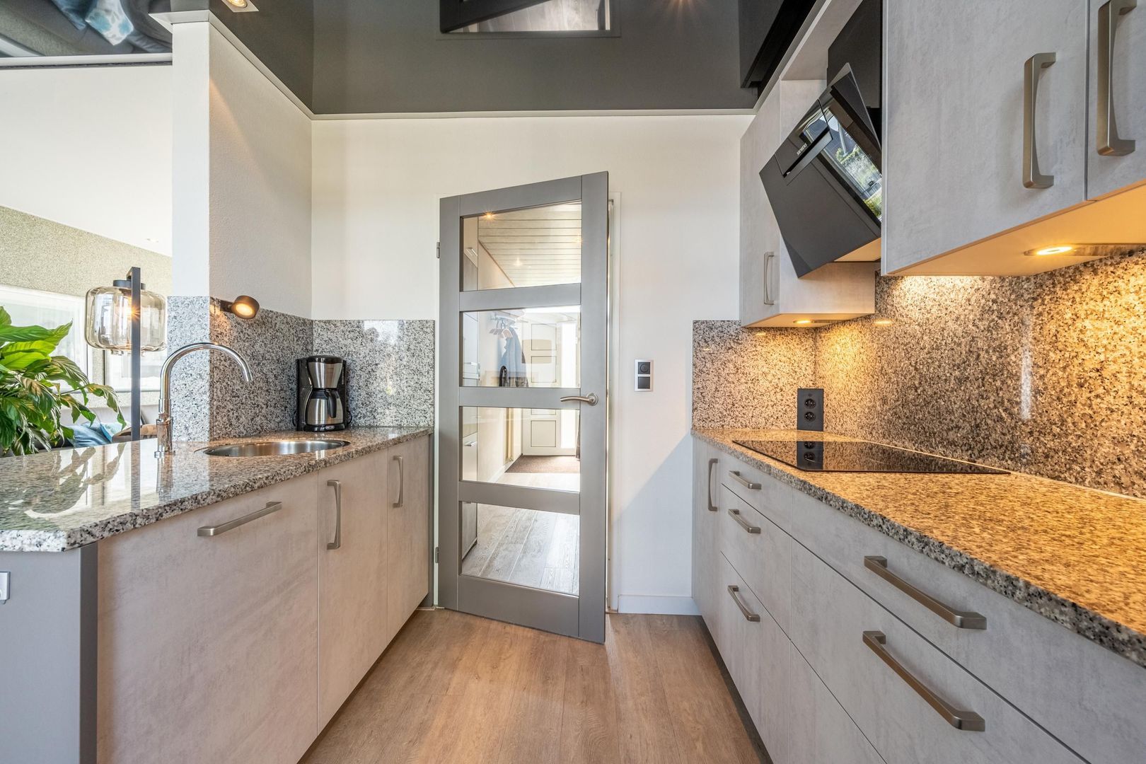 De halfopen keuken heeft een L-vormige indeling en is uitgevoerd met complete inbouwapparatuur, die in 2024 vernieuwd is.