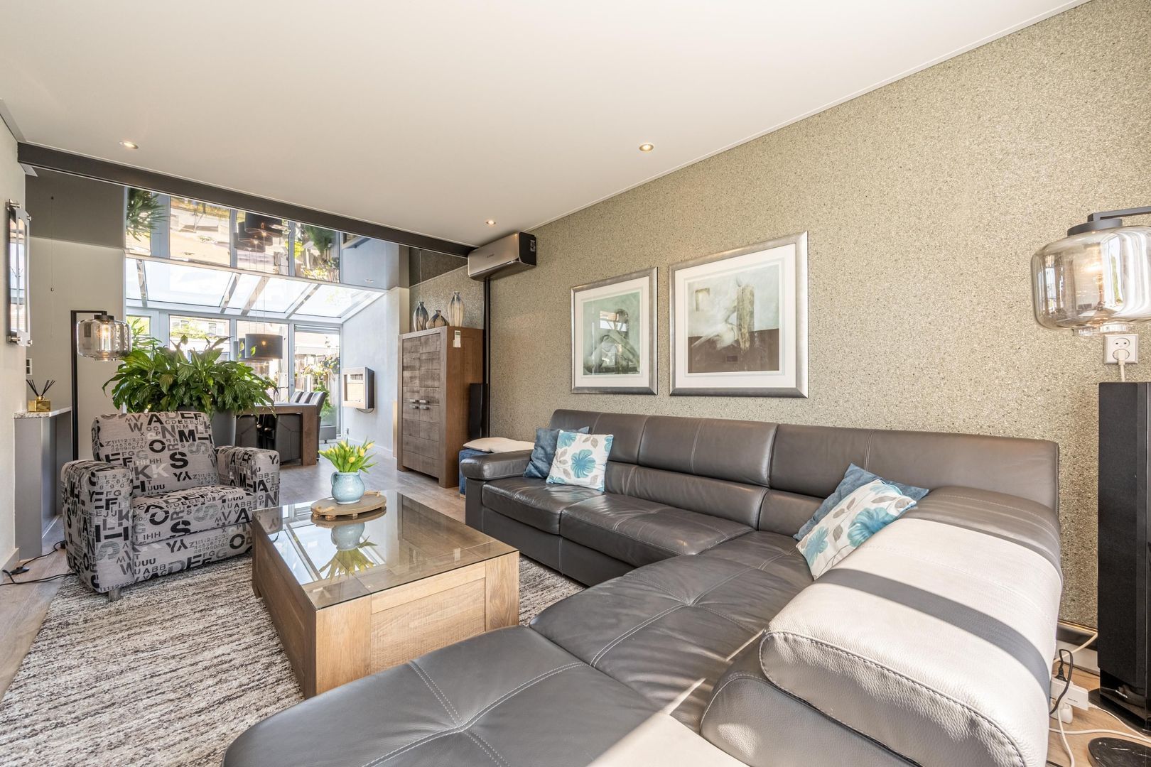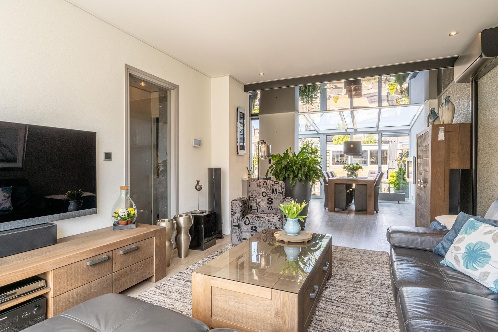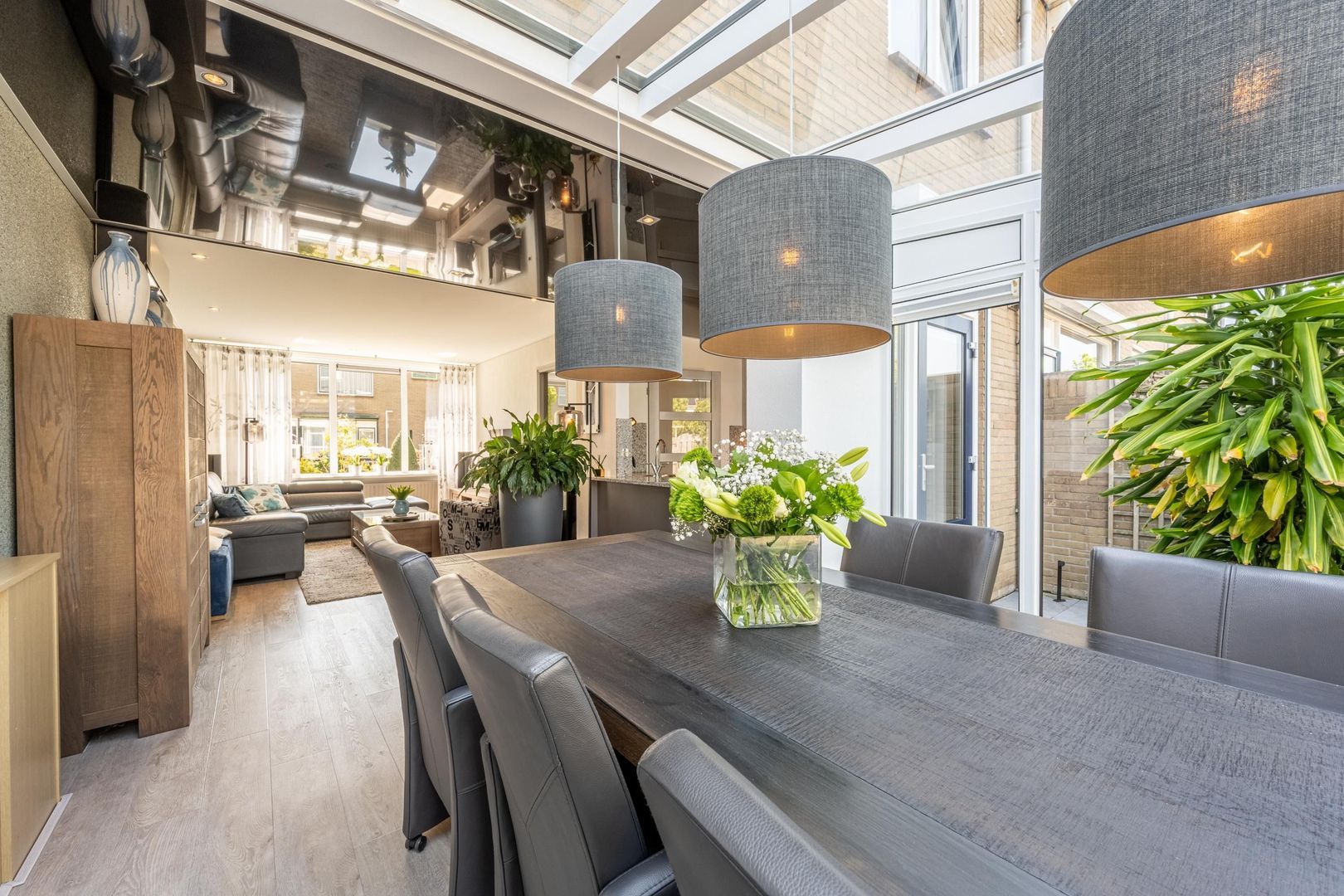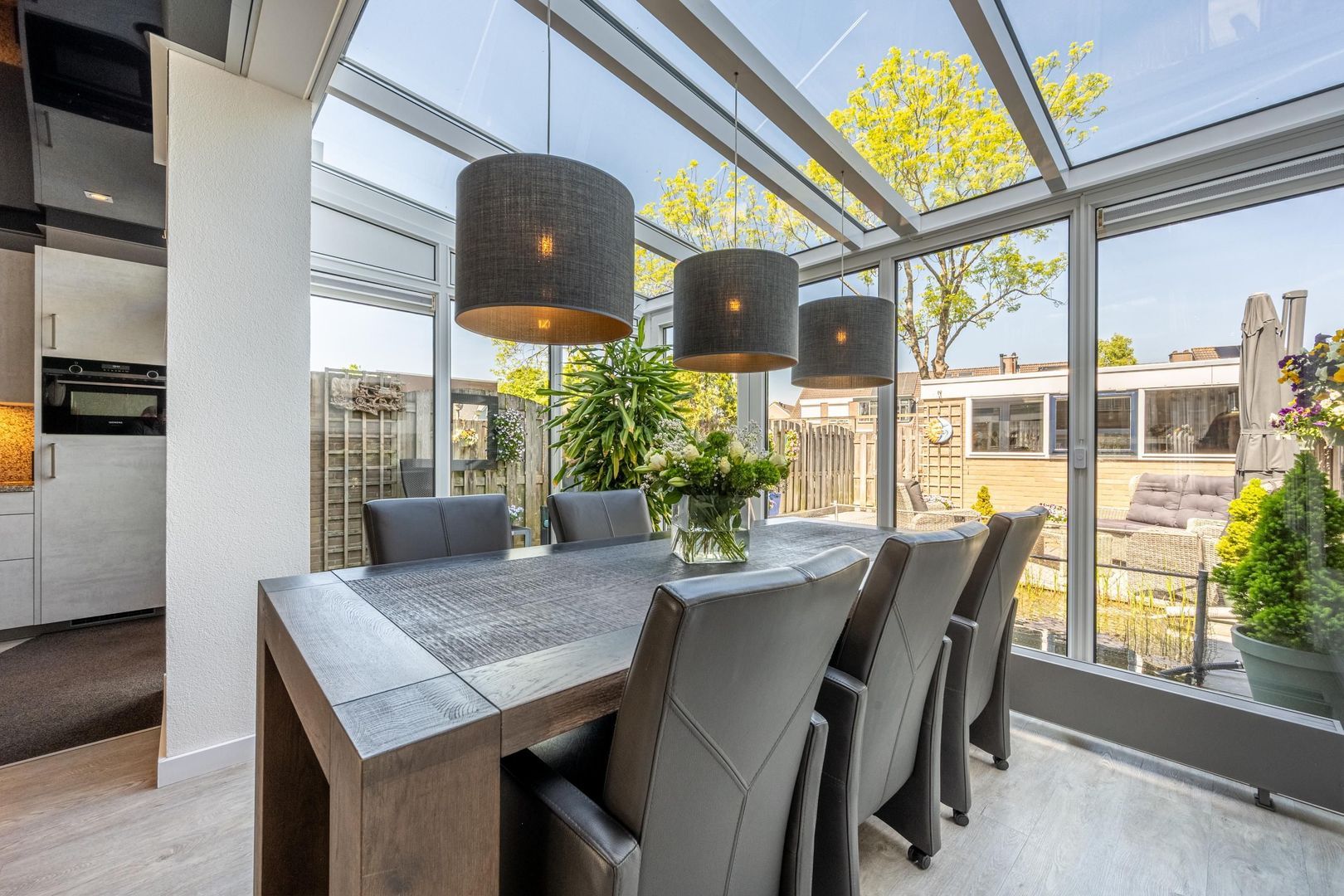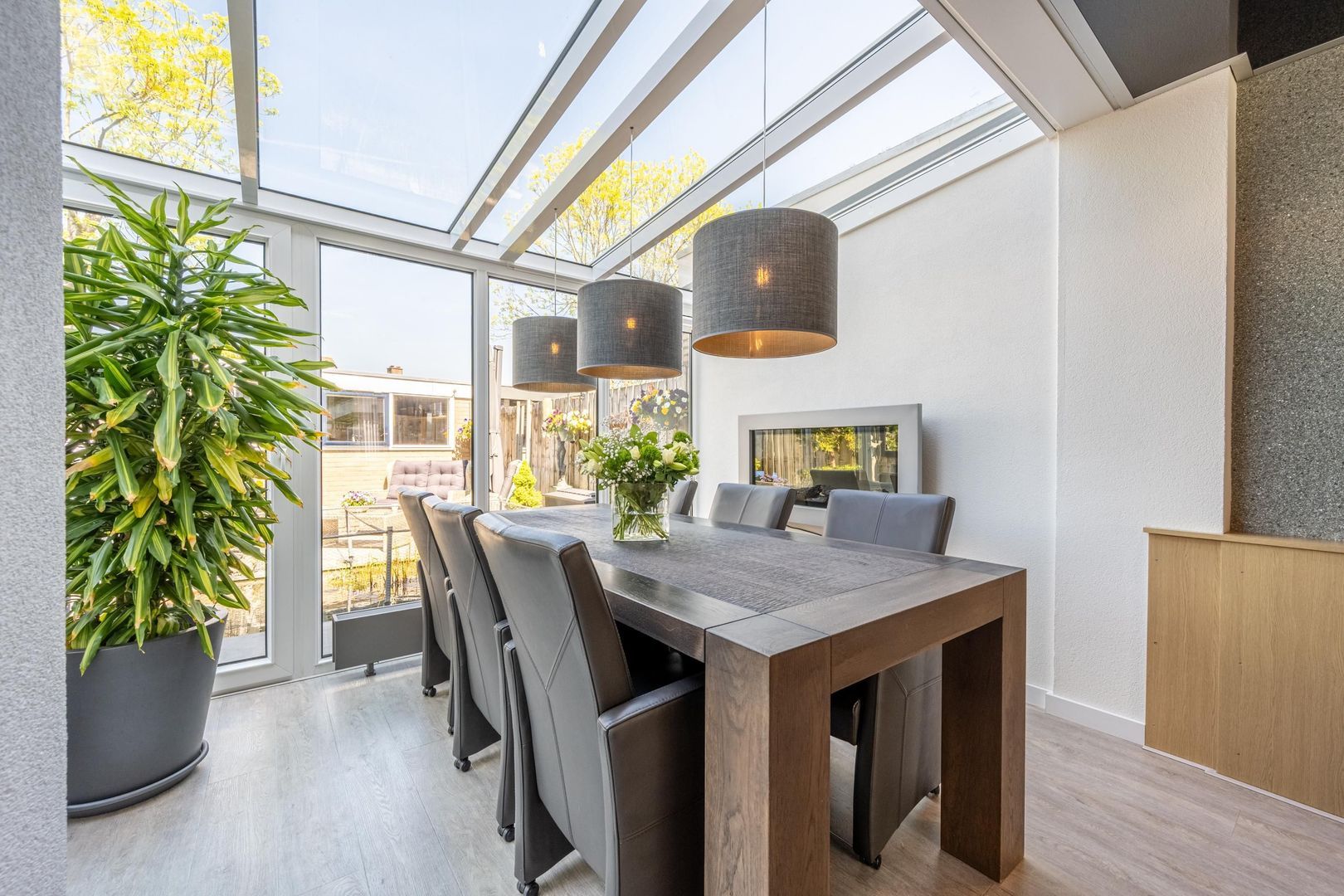 De doorzon woonkamer heeft grote ramen, waardoor het prettig licht is. In de aangebouwde serre kan worden genoten van de eerste voorjaarszon.