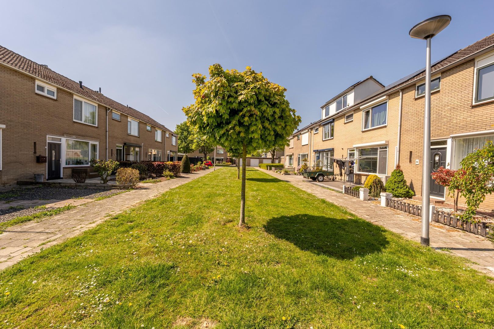 Het prettige aan de ligging van dit huis is dat de woning aan de voorzijde grenst aan een groenstrook, zonder verkeer. Achter daarentegen grenst het huis aan een niet doorgaande weg met parkeerplekken.